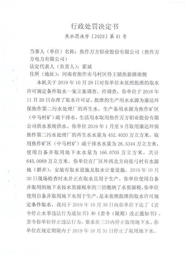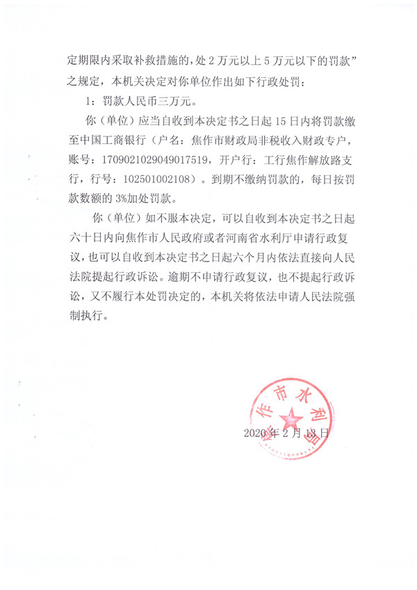 焦作市水利局行政处罚决定书焦水罚决字[2020]第01号