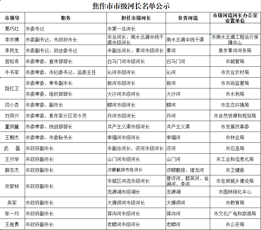 2022年焦作市市级河长名单公示