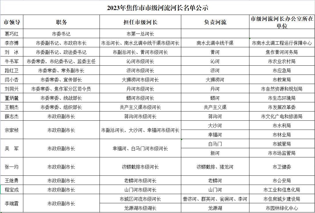 2023年焦作市市级河流河长名单公示