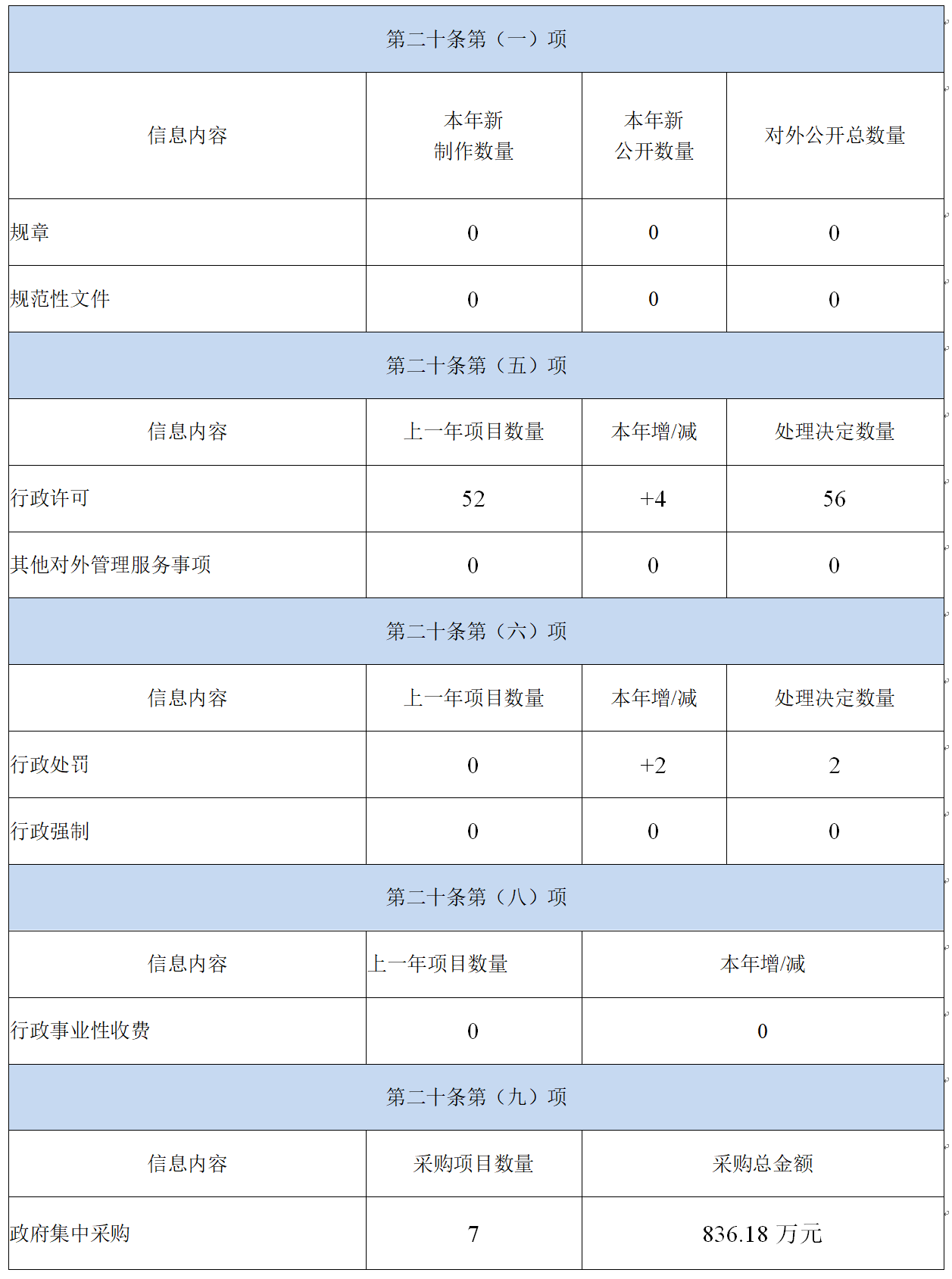 依据新修订的《中华人民共和国政府信息公开条例》有关规定,现向社会公布焦作市水利局2023年度政府信息公开年度报告。全文包括政府信息公开的总体情况,主动公开政府信息情况,收到和处理政府信息公开上申请情况,政府信息公开行政复议、行政诉讼情况,存在的主要问题及改进的情况,其他需要报告的事项。本报告中所列数据的统计期限自2023年1月1日起至2023年12月31日止。本报告在“焦作水利网”(http://slj.jiaozuo.gov.cn/)公布,欢迎查阅。如对本报告有任何疑问,请与焦作市水利局办公室联系(地址:焦作市焦东南路3226号;邮编:454002;电话:0391—3556100;传真:0391—3556100;电子邮箱:jzslbgs@126.com)。 一、总体情况 2023年,我局坚持以习近平新时代中国特色社会主义思想为指导,全面贯彻党的二十大精神,落实市委、市政府关于全面推进政务公开工作的决策部署,紧紧围绕水利高质量发展和群众关注关切,着力提升政府信息公开质量,夯实公开工作基础,扎实有序推进政务公开工作。 (一)行政许可公开。所有行政许可事项依规定在“信用焦作”、“焦作水利网双公示专栏”等网站予以公示。2023年共收到行政许可申请事项56件,均为当面申请;行政许可申请事项办结数为56件,全部按时办结,无1件超期或者延期事项。 (二)管理规范信息公开。公开了中共焦作市水利局党组关于巡察整改进展情况的通报、焦作市水利局关于取消水利工程项目招标文件事前备案事项的通知、焦作市淤地坝三个责任人名单、焦作市小型水库大坝安全责任人和防汛“三个责任人”名单、焦作市饮水安全监督电话等。 (三)公共资金使用公开。在招投标信息中公开全市水利重点项目工程的招投标情况等信息;在工作动态中公开水利项目工程的进展及动态目标管理情况;在法律法规中公开水利方面的政策法规;在重大项目建设专栏中公开大沙河水毁修复项目信息等。 (四)规范政府采购。逐步规范政府采购行为,2023年全年采购项目共7项,采购总金额836.18万元。 (五)加强平台建设。以市水利局门户网站为政府信息公开主平台,主动公开机构职能、政策法规、项目信息等政府信息,充分利用政务新媒体平台,及时发布相应信息,内容涵盖水利公告、水利新闻、工作动态等信息,其中门户网站共发布信息867条,政务动态更新量550条,信息公开目录信息更新量50条,微信发布信息39条。 (六)强化监督保障。在市水利局门户网站设置网上互动版块,开辟了共同关注全市水利建设的平台,充分听取公众意见。针对群众网上提问做到及时答复,2023年共受理政务提问8条,答复率100%。 (七)严格政府信息管理。完善建立了网站信息发布管理制度,同时规范信息审核发布机制,严格落实“三审三校”制度,加强信息发布审核把关力度,以确保发布信息的安全性、准确性和实效性。