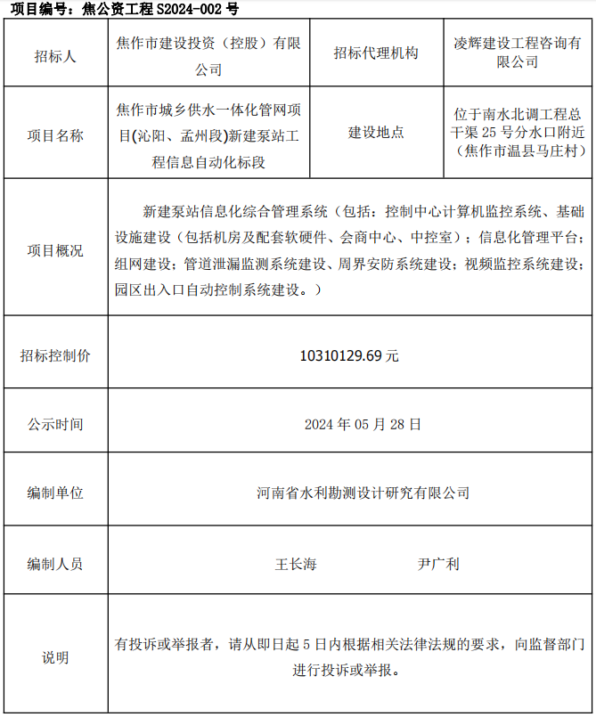 焦作市城乡供水一体化管网项目(沁阳、孟州段)新建泵站工程信息自动化标段控制价公告