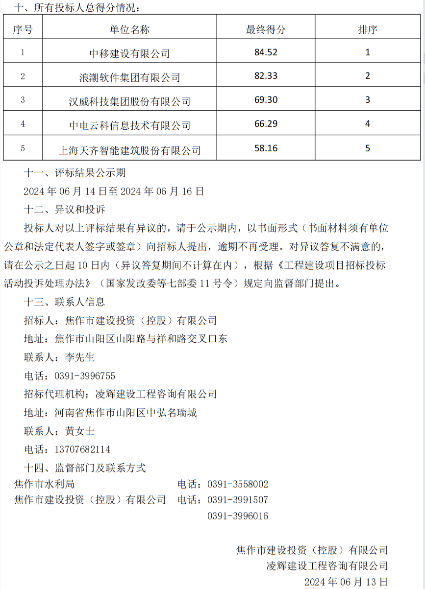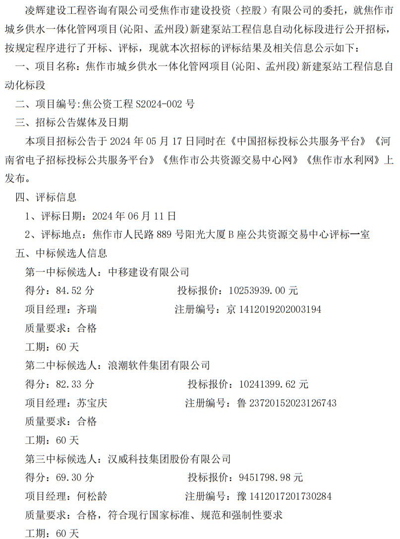 焦作市城乡供水一体化管网项目(沁阳、孟州段)新建泵站工程信息自动化标段中标候选人公示